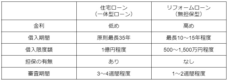 上の表は、住宅ローンとリフォームローンの違いを簡単にまとめたものです。記載の数値はあくまでも目安であり、金融機関や取扱商品によって異なります。