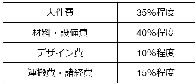 リノベーション費用は、主に「人件費」「材料・設備費」「デザイン費」「運搬費・諸経費」からなります。各項目の一般的な構成割合は、次のとおりです。