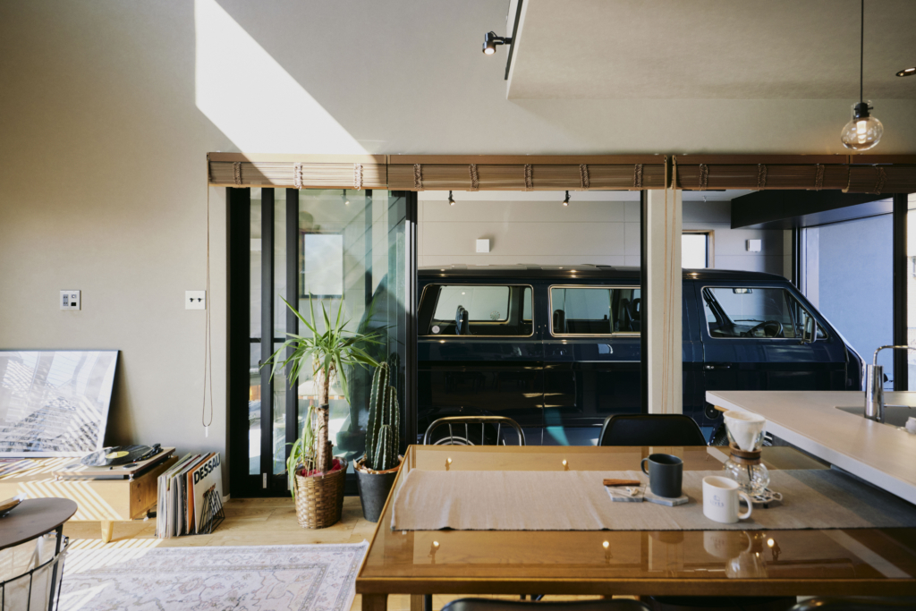 - ビルトインガレージ:リビングからガレージが見える開放的な間取り。ガレージの壁には木製の棚が設置されている。