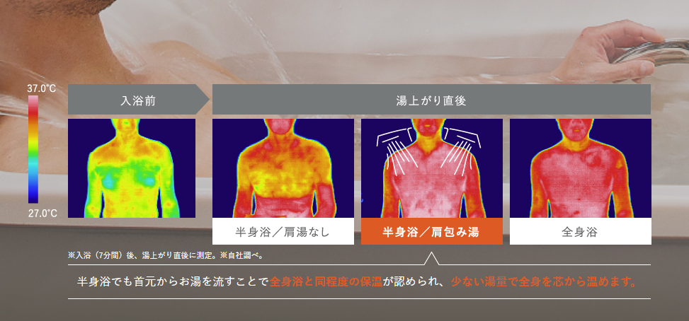 温まるまでの時間に違いはあれど、肩湯もオーバーヘッドシャワーも、全身が温まっていることがわかります。
