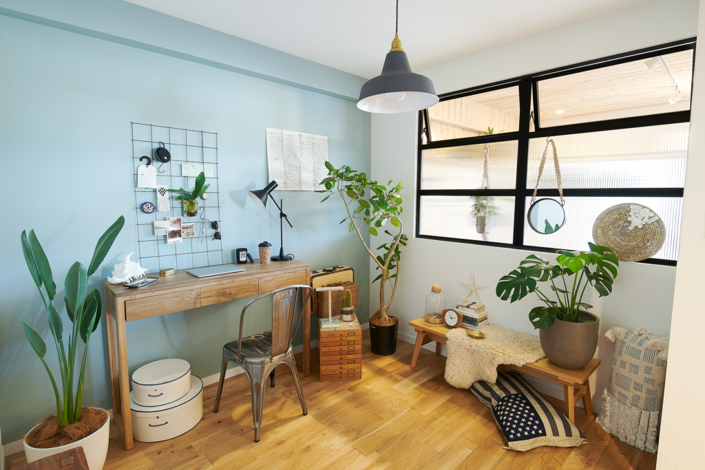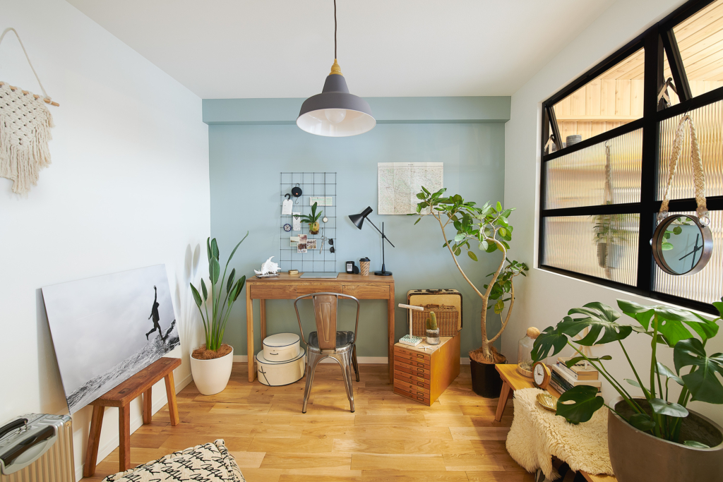 リビングの一角に設けられたワークスペースは、自分だけの時間を過ごすための空間。 コンパクトながらも、お気に入りのアートや本を飾ることで、創造性が刺激されます。 仕事に集中する「静」の時間と、新しいアイデアが生まれる「動」の時間が、ここで心地よく交差します。
